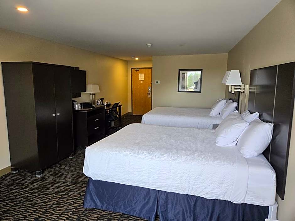 This accessible room contains bathroom rails, a raised toilet seat with grab bars, a roll-in shower and closed captions available on the TV. Additional amenities include free WiFi, a flat-screen TV, fridge, microwave and coffee maker.